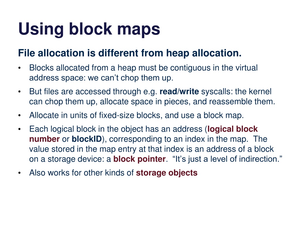 Using block maps File allocation is different from heap allocation. • Blocks allocated from a heap must be contiguous in the virtual address space: we can’t chop them up. • But files are accessed through e.g. read/writesyscalls: the kernel can chop them up, allocate space in pieces, and reassemble them. • Allocate in units of fixed-size blocks, and use a block map. • Each logical block in the object has an address (logical block numberor blockID), corresponding to an index in the map. The value stored in the map entry at that index is an address of a block on a storage device: a block pointer. “It’s just a level of indirection.” • Also works for other kinds of storage objects