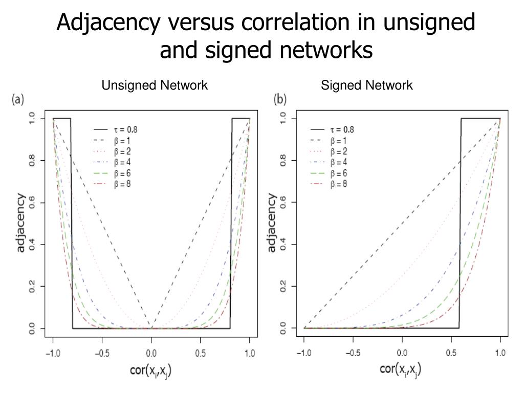 Two types of weighted correlation networks Default values: β=6 for unsigned and β=12 for signed networks. We prefer signed networks… Zhang et al SAGMB Vol. 4: No. 1, Article 17.