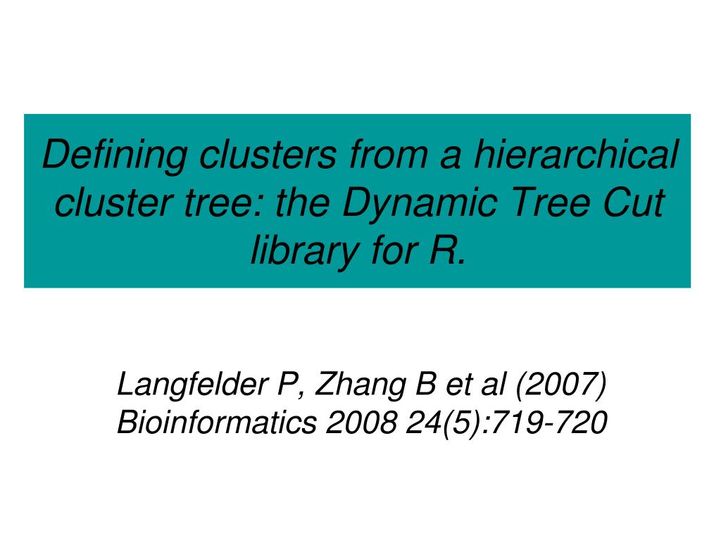 Defining clusters from a hierarchical cluster tree: the Dynamic Tree Cut library for R. Langfelder P, Zhang B et al (2007) Bioinformatics 2008 24(5):719-720