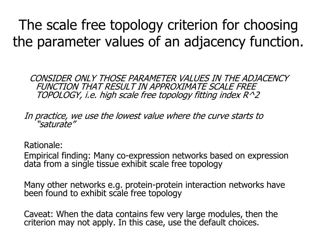 The scale free topology criterion for choosing the parameter values of an adjacency function. CONSIDER ONLY THOSE PARAMETER VALUES IN THE ADJACENCY FUNCTION THAT RESULT IN APPROXIMATE SCALE FREE TOPOLOGY, i.e. high scale free topology fitting index R^2 In practice, we use the lowest value where the curve starts to “saturate” Rationale: Empirical finding: Many co-expression networks based on expression data from a single tissue exhibit scale free topology Many other networks e.g. protein-protein interaction networks have been found to exhibit scale free topology Caveat: When the data contains few very large modules, then the criterion may not apply. In this case, use the default choices.