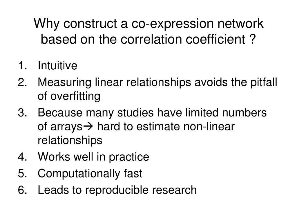 Why construct a co-expression network based on the correlation coefficient ? • Intuitive • Measuring linear relationships avoids the pitfall of overfitting • Because many studies have limited numbers of arrays hard to estimate non-linear relationships • Works well in practice • Computationally fast • Leads to reproducible research