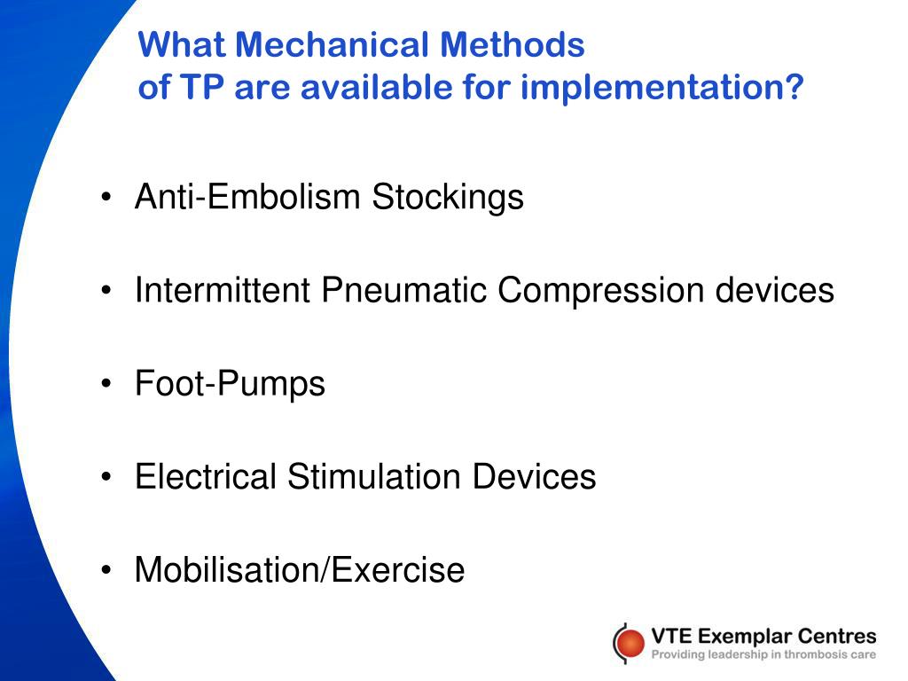 What Mechanical Methods of TP are available for implementation? • Anti-Embolism Stockings • Intermittent Pneumatic Compression devices • Foot-Pumps • Electrical Stimulation Devices • Mobilisation/Exercise
