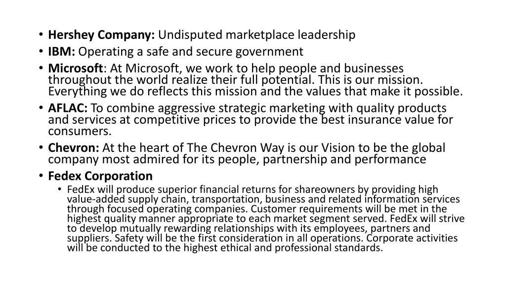 Hershey Company: Undisputed marketplace leadership • IBM: Operating a safe and secure government • Microsoft: At Microsoft, we work to help people and businesses throughout the world realize their full potential. This is our mission. Everything we do reflects this mission and the values that make it possible. • AFLAC: To combine aggressive strategic marketing with quality products and services at competitive prices to provide the best insurance value for consumers. • Chevron: At the heart of The Chevron Way is our Vision to be the global company most admired for its people, partnership and performance • Fedex Corporation • FedEx will produce superior financial returns for shareowners by providing high value-added supply chain, transportation, business and related information services through focused operating companies. Customer requirements will be met in the highest quality manner appropriate to each market segment served. FedEx will strive to develop mutually rewarding relationships with its employees, partners and suppliers. Safety will be the first consideration in all operations. Corporate activities will be conducted to the highest ethical and professional standards.