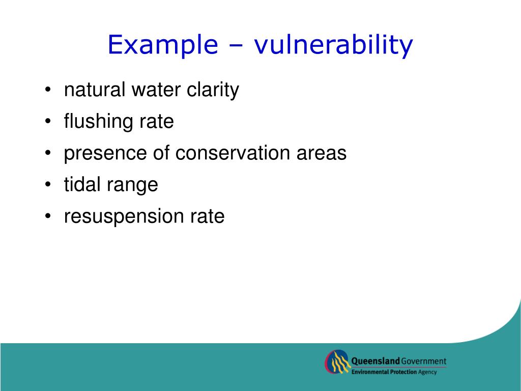 Example – vulnerability • natural water clarity • flushing rate • presence of conservation areas • tidal range • resuspension rate