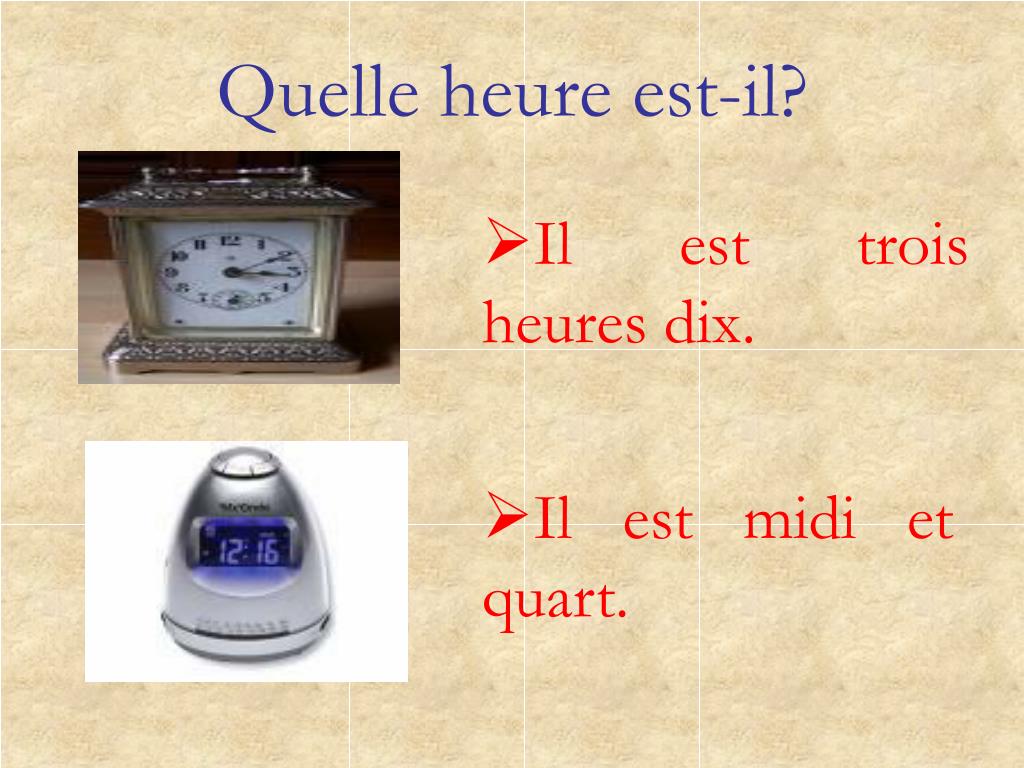 Quelle heure est-il? • Il est trois heures dix. • Il est midi et quart.