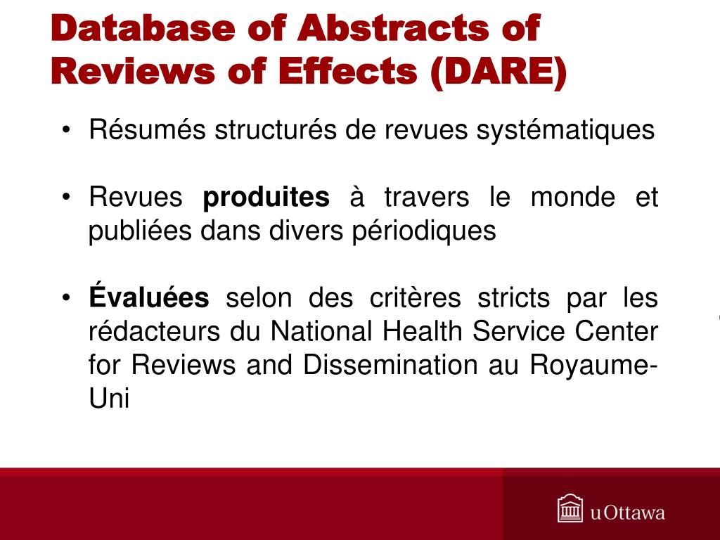 Database of Abstracts of Reviews of Effects (DARE) • Résumés structurés de revues systématiques • Revues produitesà travers le monde et publiéesdans divers périodiques • Évaluéesselon des critères stricts par les rédacteurs du National Health Service Center for Reviews and Dissemination au Royaume-Uni