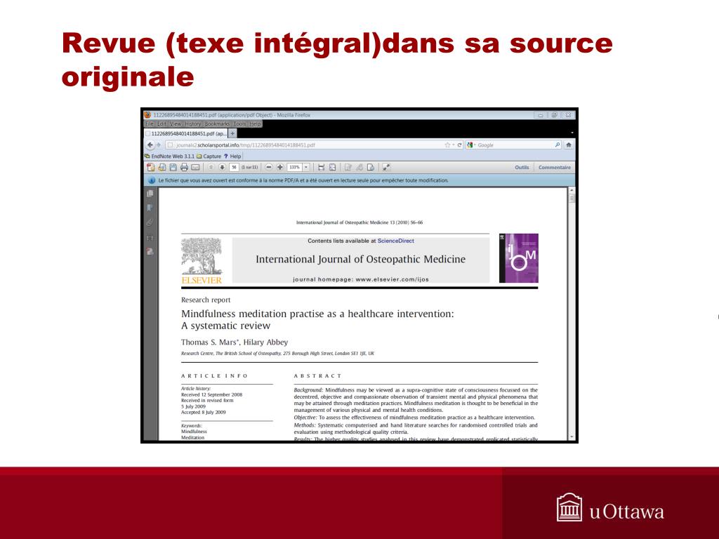 Accéder à EBM Reviews: plusieursfaçons • Se rendre à notrepage d’accueil, Ressourcesclés • Bases de données A-Z, C, Cochrane, E, EBMR… • Guides sujets en santé (sciences inf., réadaptation), Trouver des articles, bases de données pertinentes