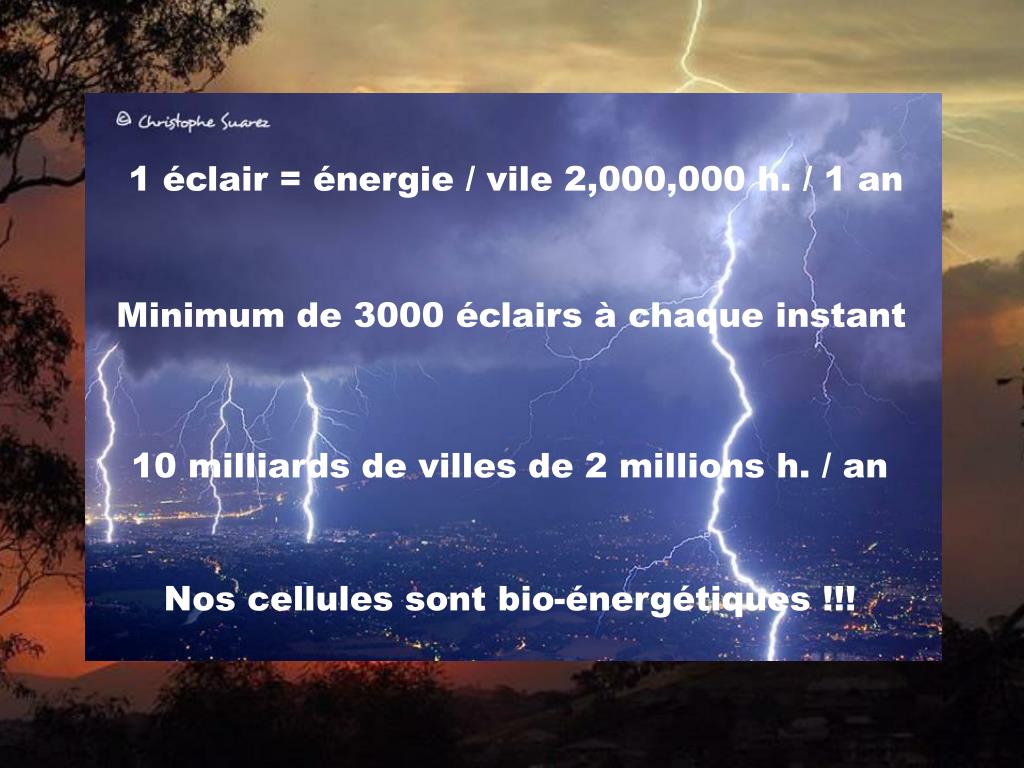 1 éclair = énergie / vile 2,000,000 h. / 1 an Minimum de 3000 éclairs à chaque instant 10 milliards de villes de 2 millions h. / an Nos cellules sont bio-énergétiques !!!