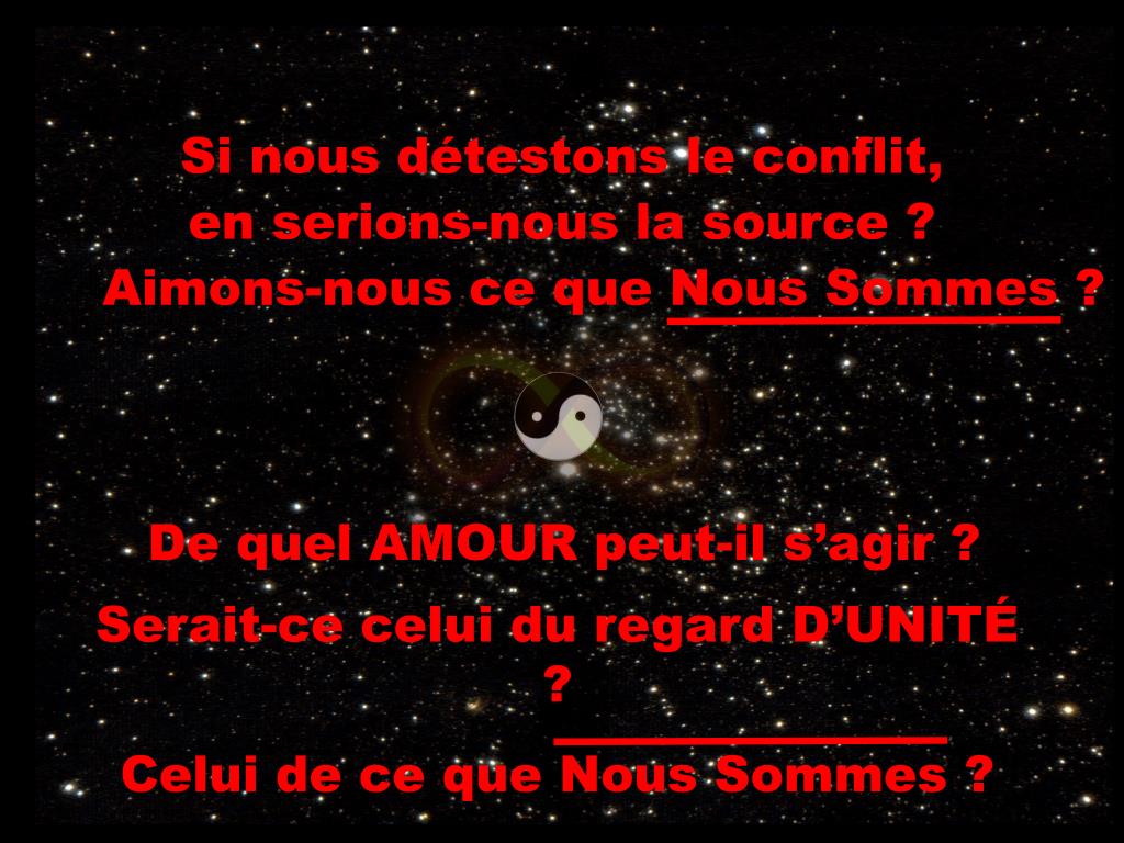 Si nous détestons le conflit, en serions-nous la source ? Aimons-nous ce que Nous Sommes ? De quel AMOUR peut-il s’agir ? Serait-ce celui du regard D’UNITÉ ? Celui de ce que Nous Sommes ?