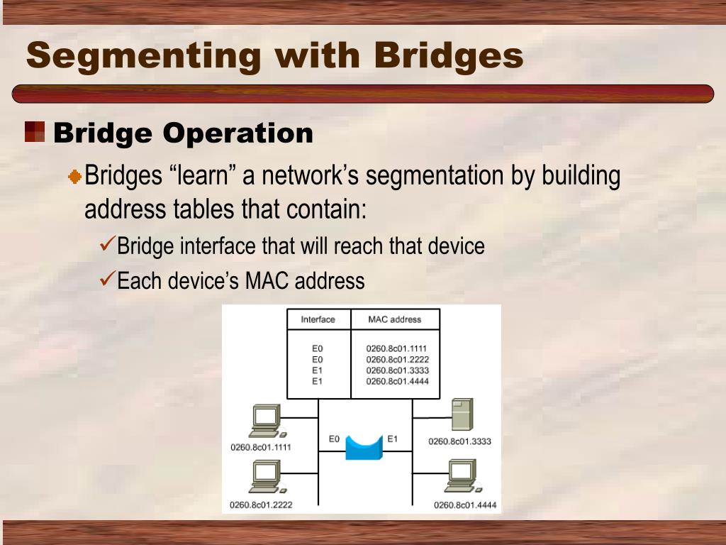 Segmenting with Bridges • Bridge Operation • Bridges “learn” a network’s segmentation by building address tables that contain: • Bridge interface that will reach that device • Each device’s MAC address