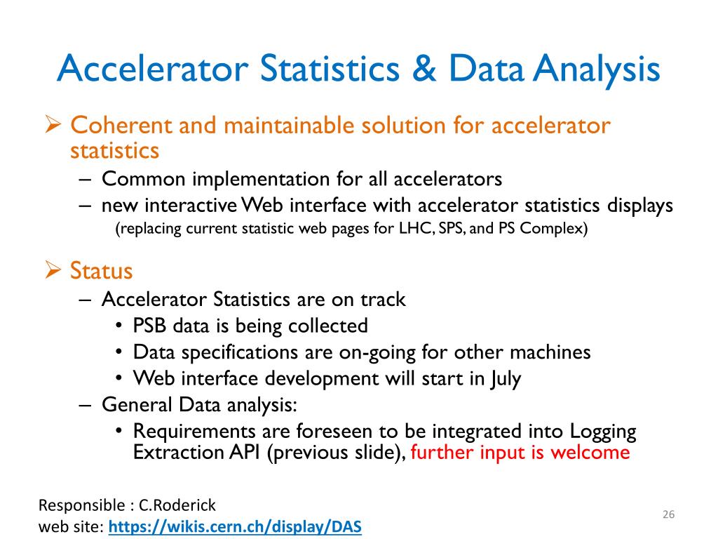 Accelerator Statistics & Data Analysis • Coherent and maintainable solution for accelerator statistics • Common implementation for all accelerators • new interactive Web interface with accelerator statistics displays (replacing current statistic web pages for LHC, SPS, and PS Complex) • Status • Accelerator Statistics are on track • PSB data is being collected • Data specifications are on-going for other machines • Web interface development will start in July • General Data analysis: • Requirements are foreseen to be integrated into Logging Extraction API (previous slide), further input is welcome Responsible : C.Roderick web site: https://wikis.cern.ch/display/DAS