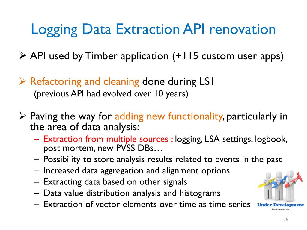 Logging Data Extraction API renovation • API used by Timber application (+115 custom user apps) • Refactoring and cleaning done during LS1 (previous API had evolved over 10 years) • Paving the way for adding new functionality, particularly in the area of data analysis: • Extraction from multiple sources : logging, LSA settings, logbook, post mortem, new PVSS DBs… • Possibility to store analysis results related to events in the past • Increased data aggregation and alignment options • Extracting data based on other signals • Data value distribution analysis and histograms • Extraction of vector elements over time as time series