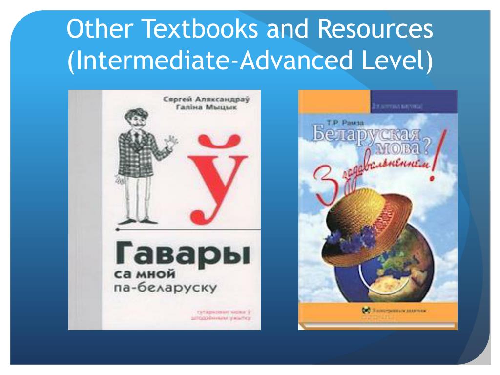 Textbooks for Russian-Speaking/Intermediate-Advanced Students • С. Аляксандраў і Г. Мыцык.Гаварыса мной па-беларуску/ Говори со мной по-белорусски: Живой разговор каждый день. — Москва: Вариант, 2008. • Т. Р. Рамза. Беларускаямова? З задавальненнем! (Для замежныхнавучэнцаў). Мінск «Вышэйшая школа», 2010.