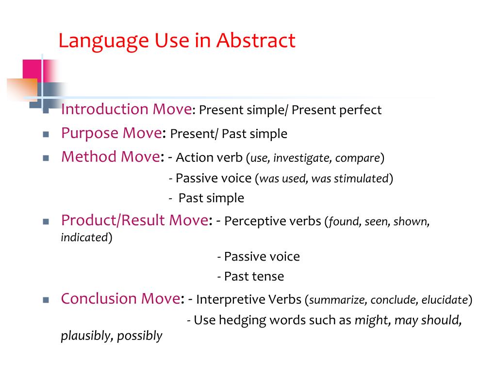 Language Use in Abstract • Introduction Move: Present simple/ Present perfect • Purpose Move: Present/ Past simple • Method Move: - Action verb (use, investigate, compare) - Passive voice (was used, was stimulated) - Past simple • Product/Result Move: - Perceptive verbs (found, seen, shown, indicated) - Passive voice - Past tense • Conclusion Move: - Interpretive Verbs (summarize, conclude, elucidate) - Use hedging words such as might, may should, plausibly, possibly
