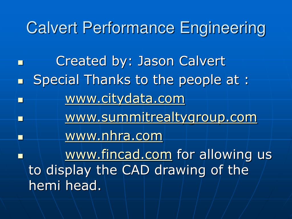 Calvert Performance Engineering • Created by: Jason Calvert • Special Thanks to the people at : • www.citydata.com • www.summitrealtygroup.com • www.nhra.com • www.fincad.com for allowing us to display the CAD drawing of the hemi head.