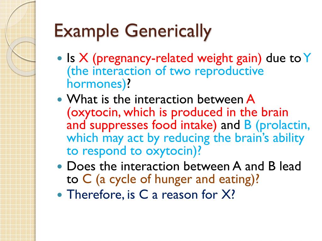 Example Generically • Is X (pregnancy-related weight gain) due to Y (the interaction of two reproductive hormones)? • What is the interaction between A (oxytocin, which is produced in the brain and suppresses food intake) and B (prolactin, which may act by reducing the brain’s ability to respond to oxytocin)? • Does the interaction between A and B lead to C (a cycle of hunger and eating)? • Therefore, is C a reason for X?