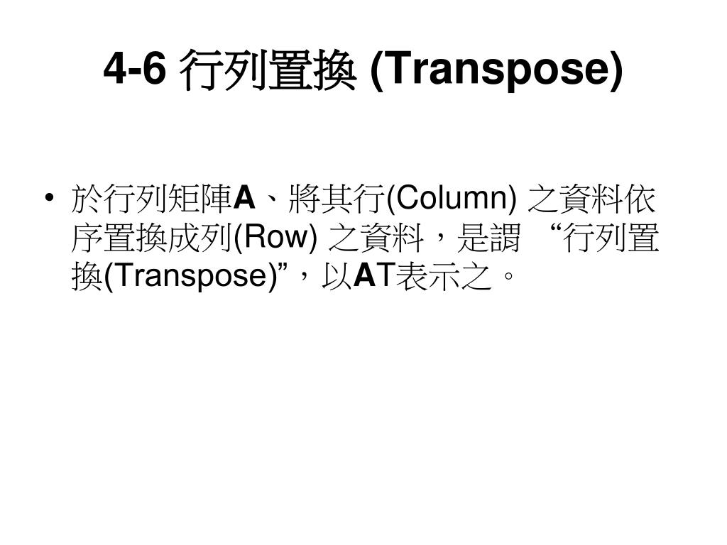 4-6 行列置換 (Transpose) • 於行列矩陣A、將其行(Column) 之資料依序置換成列(Row) 之資料,是謂 “行列置換(Transpose)”,以AT表示之。