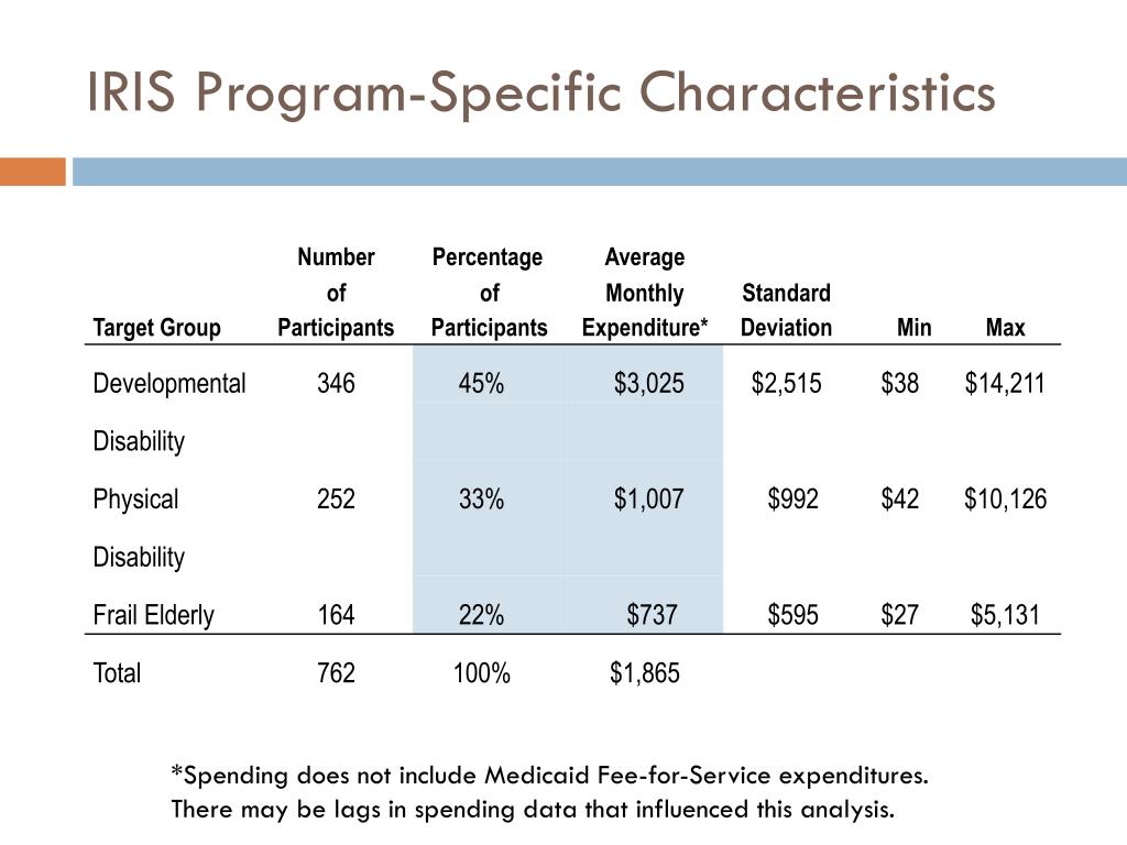 IRIS Program-Specific Characteristics *Spending does not include Medicaid Fee-for-Service expenditures. There may be lags in spending data that influenced this analysis.