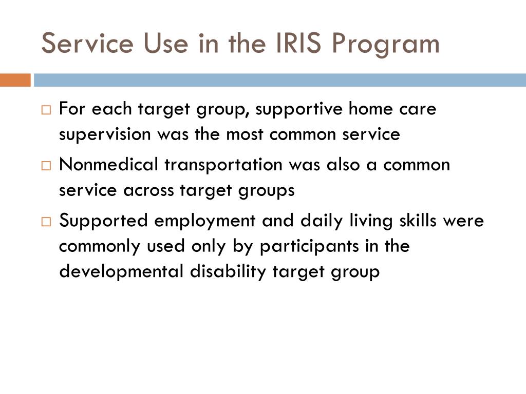 Service Use in the IRIS Program • For each target group, supportive home care supervision was the most common service • Nonmedical transportation was also a common service across target groups • Supported employment and daily living skills were commonly used only by participants in the developmental disability target group