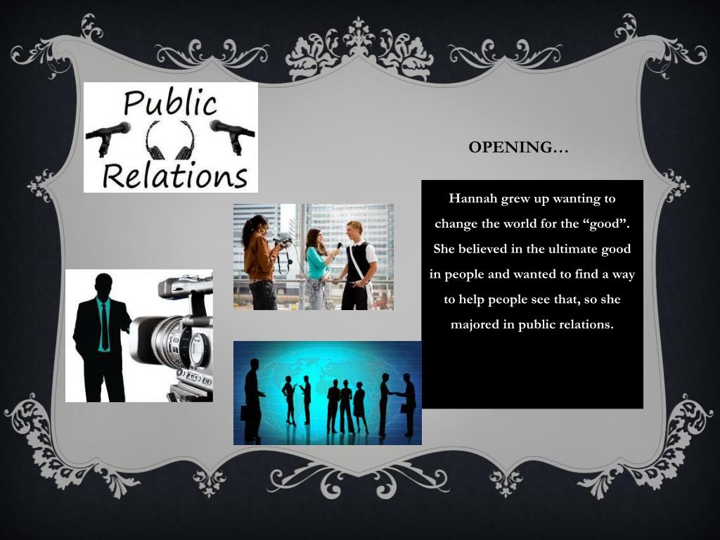 Opening… Hannah grew up wanting to change the world for the “good”. She believed in the ultimate good in people and wanted to find a way to help people see that, so she majored in public relations.