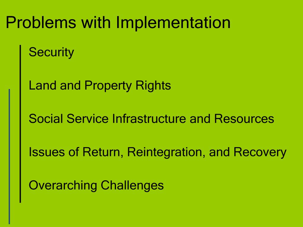 Problems with Implementation Security Land and Property Rights Social Service Infrastructure and Resources Issues of Return, Reintegration, and Recovery Overarching Challenges