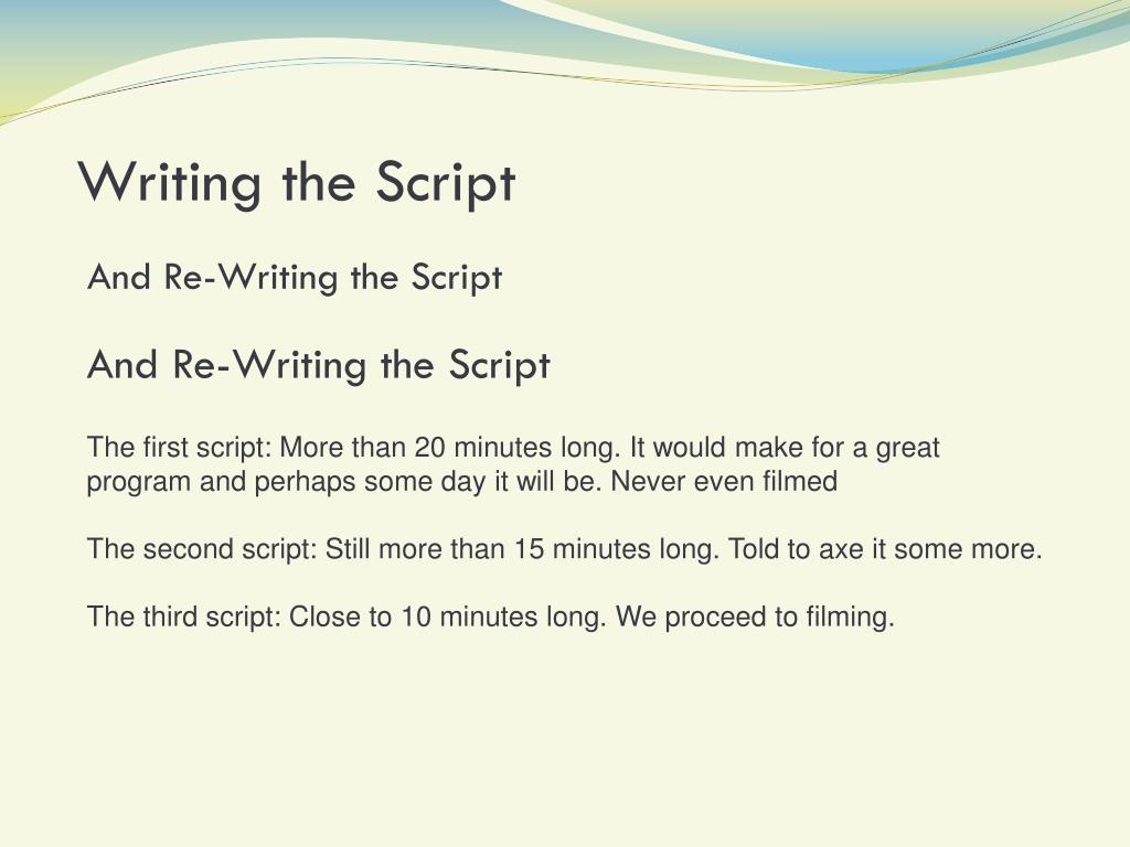Writing the Script And Re-Writing the Script And Re-Writing the Script The first script: More than 20 minutes long. It would make for a great program and perhaps some day it will be. Never even filmed The second script: Still more than 15 minutes long. Told to axe it some more. The third script: Close to 10 minutes long. We proceed to filming.