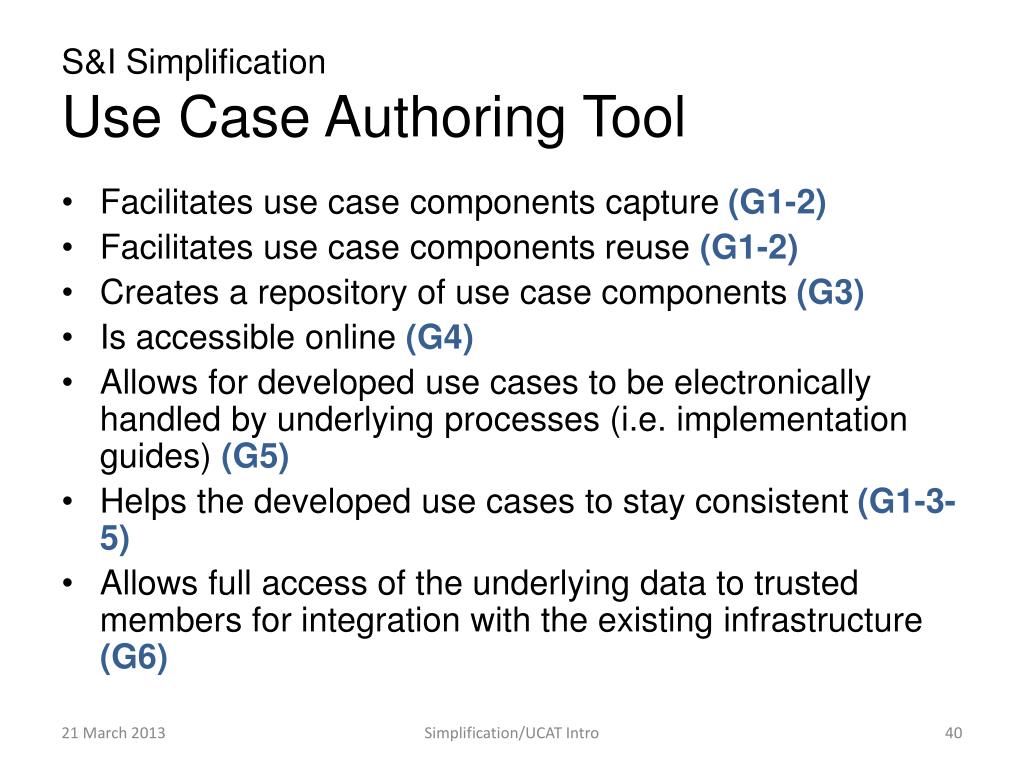 S&I SimplificationUse Case Authoring Tool • Facilitates use case components capture (G1-2) • Facilitates use case components reuse (G1-2) • Creates a repository of use case components (G3) • Is accessible online (G4) • Allows for developed use cases to be electronically handled by underlying processes (i.e. implementation guides) (G5) • Helps the developed use cases to stay consistent (G1-3-5) • Allows full access of the underlying data to trusted members for integration with the existing infrastructure (G6) Simplification/UCAT Intro