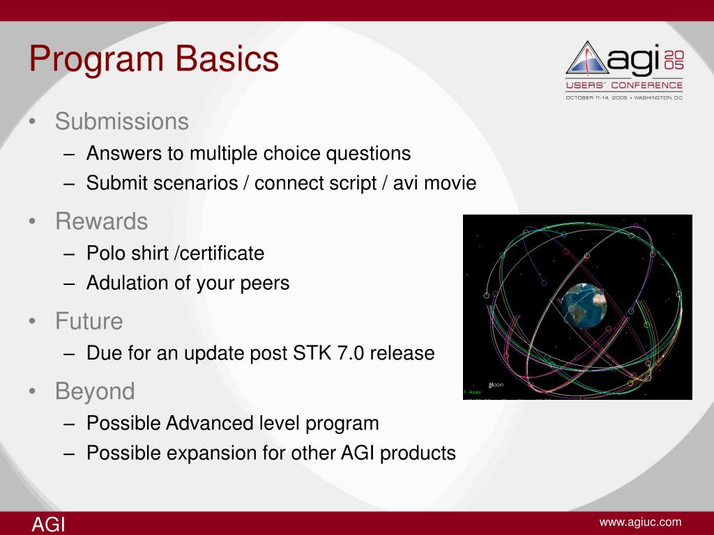Program Basics • Submissions • Answers to multiple choice questions • Submit scenarios / connect script / avi movie • Rewards • Polo shirt /certificate • Adulation of your peers • Future • Due for an update post STK 7.0 release • Beyond • Possible Advanced level program • Possible expansion for other AGI products
