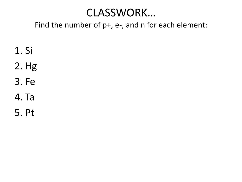 1. CLASSWORK…Find the number of p+, e-, and n for each element: 1. Si 2. Hg 3. Fe 4. Ta 5. Pt