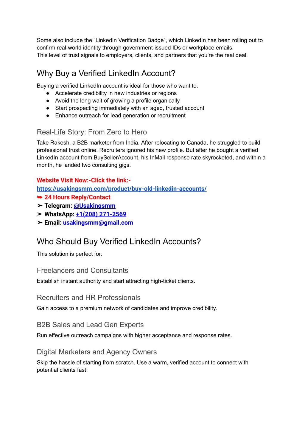 Some also include the “LinkedIn Verification Badge”, which LinkedIn has been rolling out to confirm real-world identity through government-issued IDs or workplace emails. This level of trust signals to employers, clients, and partners that you’re the real deal. Why Buy a Verified LinkedIn Account? Buying a verified LinkedIn account is ideal for those who want to: ● Accelerate credibility in new industries or regions ● Avoid the long wait of growing a profile organically ● Start prospecting immediately with an aged, trusted account ● Enhance outreach for lead generation or recruitment Real-Life Story: From Zero to Hero Take Rakesh, a B2B marketer from India. After relocating to Canada, he struggled to build professional trust online. Recruiters ignored his new profile. But after he bought a verified LinkedIn account from BuySellerAccount, his InMail response rate skyrocketed, and within a month, he landed two consulting gigs. Website Visit Now:-Click the link:- https://usakingsmm.com/product/buy-old-linkedin-accounts/ ➥ 24 Hours Reply/Contact ➤ Telegram: @Usakingsmm ➤ WhatsApp: +1(208) 271-2569 ➤ Email: usakingsmm@gmail.com Who Should Buy Verified LinkedIn Accounts? This solution is perfect for: Freelancers and Consultants Establish instant authority and start attracting high-ticket clients. Recruiters and HR Professionals Gain access to a premium network of candidates and improve credibility. B2B Sales and Lead Gen Experts Run effective outreach campaigns with higher acceptance and response rates. Digital Marketers and Agency Owners Skip the hassle of starting from scratch. Use a warm, verified account to connect with potential clients fast.