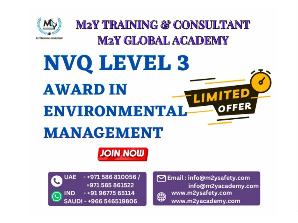 Pursue the NVQ Level 3 Award in Environmental Management with M2Y Safety Academy. Our industry-leading program equips professionals with essential skills in environmental management. Gain a recognized qualification, practical insights, and enhance your career prospects in sustainability. Join M2Y Training and Consultant to make a positive impact on the environment and unlock a greener future.<br>