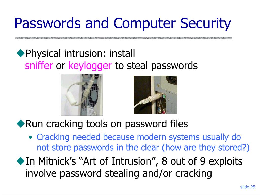 Passwords and Computer Security • Physical intrusion: install sniffer or keylogger to steal passwords • Run cracking tools on password files • Cracking needed because modern systems usually do not store passwords in the clear (how are they stored?) • In Mitnick’s “Art of Intrusion”, 8 out of 9 exploits involve password stealing and/or cracking