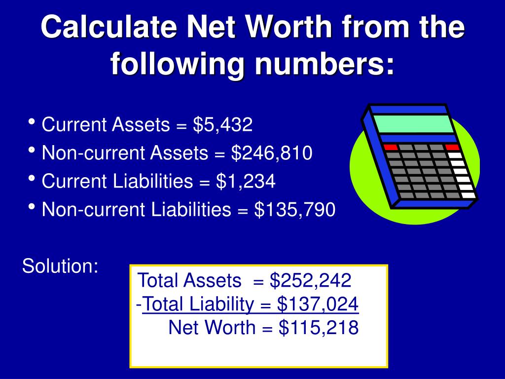 Calculate Net Worth from the following numbers: • Current Assets = $5,432 • Non-current Assets = $246,810 • Current Liabilities = $1,234 • Non-current Liabilities = $135,790 Solution: Total Assets = $252,242 -Total Liability = $137,024 Net Worth = $115,218
