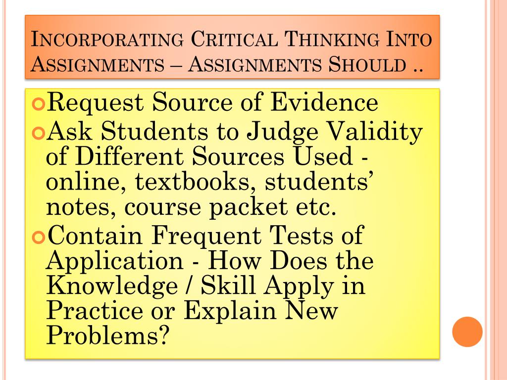 Incorporating Critical Thinking Into Assignments – Assignments Should .. • Request Source of Evidence • Ask Students to Judge Validity of Different Sources Used - online, textbooks, students’ notes, course packet etc. • Contain Frequent Tests of Application - How Does the Knowledge / Skill Apply in Practice or Explain New Problems?