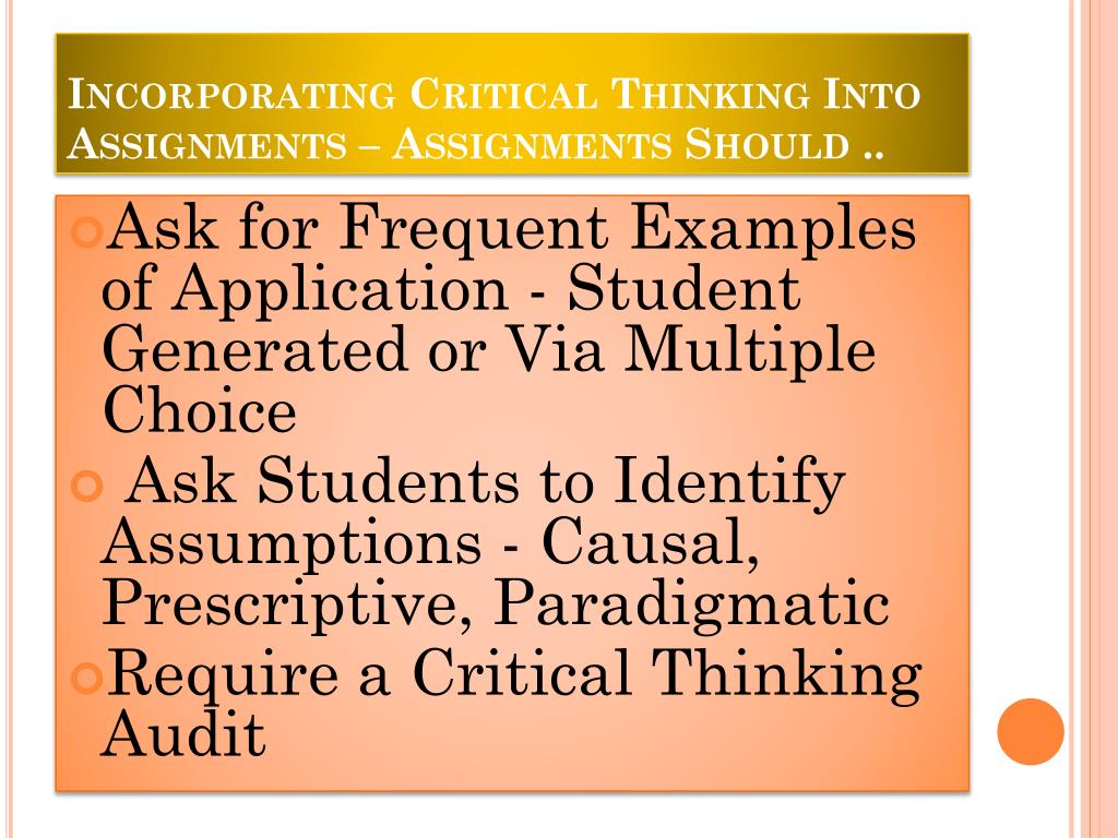 Incorporating Critical Thinking Into Assignments – Assignments Should .. • Ask for Frequent Examples of Application - Student Generated or Via Multiple Choice • Ask Students to Identify Assumptions - Causal, Prescriptive, Paradigmatic • Require a Critical Thinking Audit