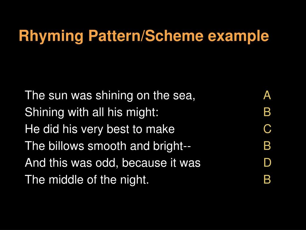 Rhyming Pattern/Scheme example The sun was shining on the sea, A Shining with all his might: B He did his very best to make C The billows smooth and bright-- B And this was odd, because it was D The middle of the night. B