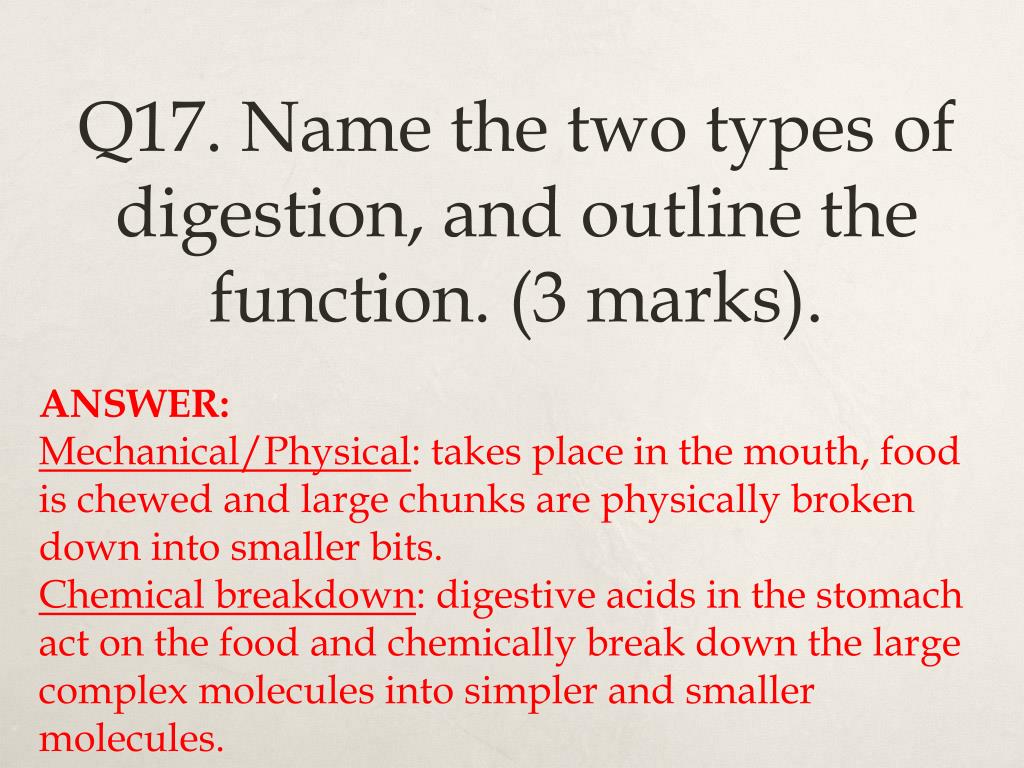 Q17. Name the two types of digestion, and outline the function. (3 marks). ANSWER: Mechanical/Physical: takes place in the mouth, food is chewed and large chunks are physically broken down into smaller bits.Chemical breakdown: digestive acids in the stomach act on the food and chemically break down the large complex molecules into simpler and smaller molecules.