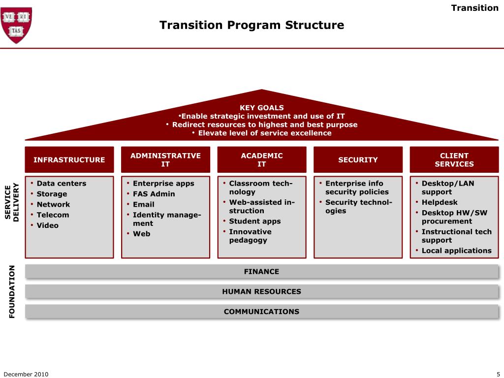 Transition Transition Program Structure • KEY GOALS • Enable strategic investment and use of IT • Redirect resources to highest and best purpose • Elevate level of service excellence INFRASTRUCTURE ADMINISTRATIVE IT ACADEMICIT SECURITY CLIENTSERVICES • Data centers • Storage • Network • Telecom • Video • Enterprise apps • FAS Admin • Email • Identity manage-ment • Web • Classroom tech-nology • Web-assisted in-struction • Student apps • Innovative pedagogy • Enterprise info security policies • Security technol-ogies • Desktop/LAN support • Helpdesk • Desktop HW/SW procurement • Instructional tech support • Local applications SERVICEDELIVERY FINANCE HUMAN RESOURCES FOUNDATION COMMUNICATIONS