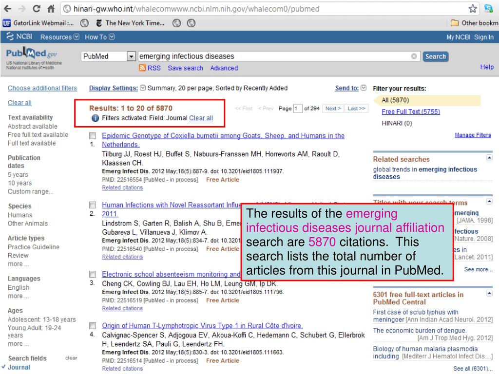 The results of the emerging infectious diseases journal affiliation search are 5870 citations. This search lists the total number of articles from this journal in PubMed.