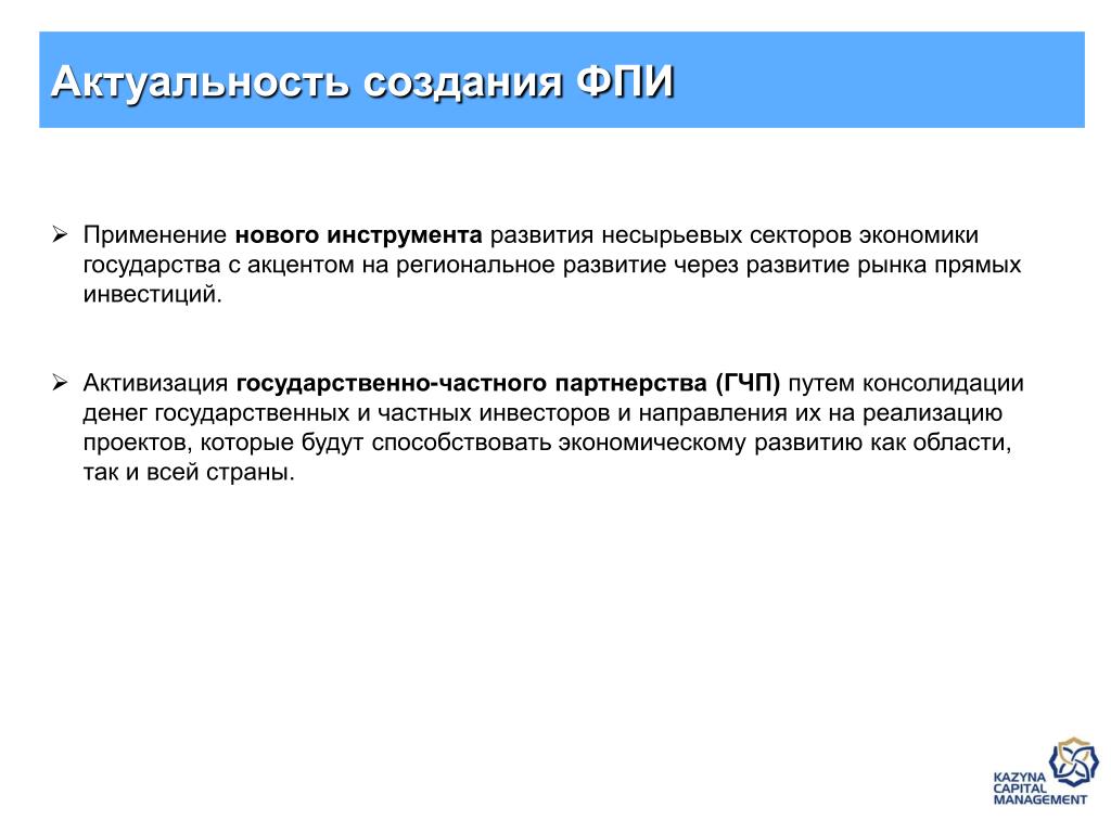 Актуальность создания ФПИ • Применение нового инструмента развития несырьевых секторов экономики государства с акцентом на региональное развитие через развитие рынка прямых инвестиций. • Активизация государственно-частного партнерства (ГЧП) путем консолидации денег государственных и частных инвесторов и направления их на реализацию проектов, которые будут способствовать экономическому развитию как области, так и всей страны.