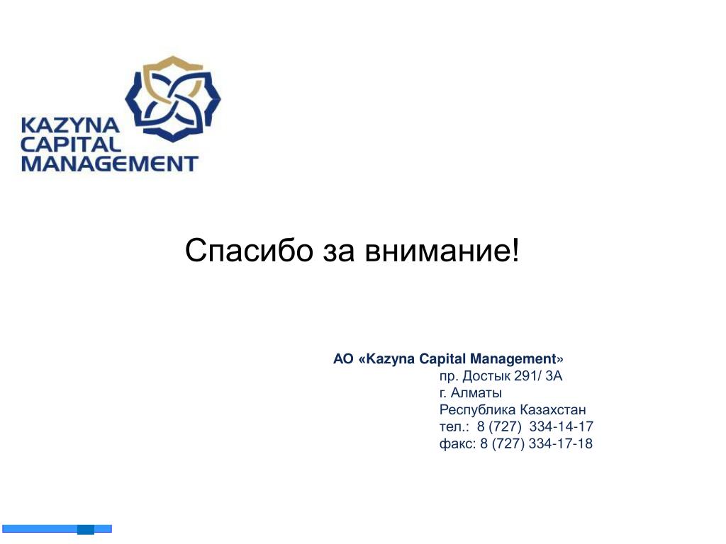Спасибо за внимание! • АО «Kazyna Capital Management» • пр. Достык 291/ 3А • г. Алматы • Республика Казахстан • тел.: 8 (727) 334-14-17 • факс: 8 (727) 334-17-18 г. Астана