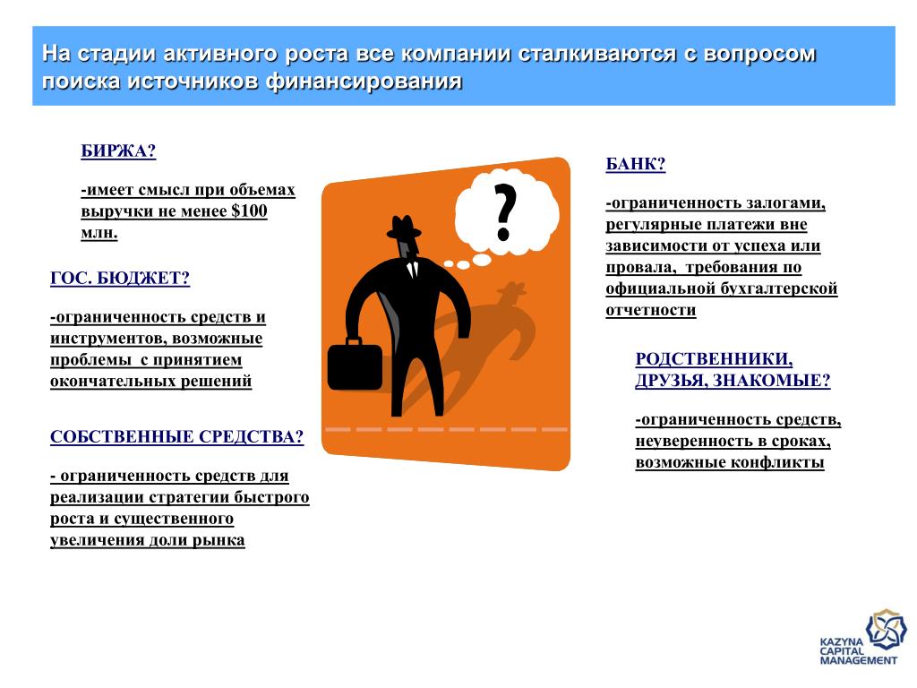 На стадии активного роста все компании сталкиваются с вопросом поиска источников финансирования БИРЖА? -имеет смысл при объемах выручки не менее $100 млн. БАНК? -ограниченность залогами, регулярные платежи вне зависимости от успеха или провала, требования по официальной бухгалтерской отчетности ГОС. БЮДЖЕТ? -ограниченность средств и инструментов, возможные проблемы с принятием окончательных решений РОДСТВЕННИКИ, ДРУЗЬЯ, ЗНАКОМЫЕ? -ограниченность средств, неуверенность в сроках, возможные конфликты СОБСТВЕННЫЕ СРЕДСТВА? - ограниченность средств для реализации стратегии быстрого роста и существенного увеличения доли рынка