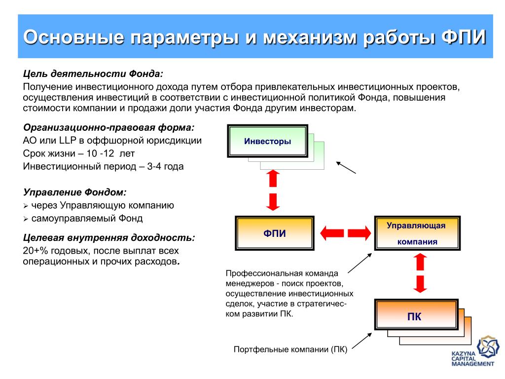 Основные параметры и механизм работы ФПИ Цель деятельности Фонда: Получение инвестиционного дохода путем отбора привлекательных инвестиционных проектов, осуществления инвестиций в соответствии с инвестиционной политикой Фонда, повышения стоимости компании и продажи доли участия Фонда другим инвесторам. Организационно-правовая форма: АО или LLP в оффшорной юрисдикции Срок жизни – 10 -12 лет Инвестиционный период – 3-4 года Управление Фондом: • через Управляющую компанию • самоуправляемый Фонд Целевая внутренняя доходность: 20+% годовых, после выплат всех операционных и прочих расходов. Инвесторы ФПИ Управляющая компания Профессиональная команда менеджеров - поиск проектов, осуществление инвестиционных сделок, участие в стратегичес-ком развитии ПК. ПК Портфельные компании (ПК)