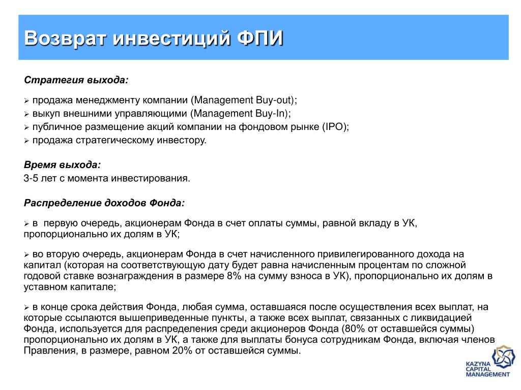 Возврат инвестиций ФПИ Стратегия выхода: • продажа менеджменту компании (Management Buy-out); • выкуп внешними управляющими (Management Buy-In); • публичное размещение акций компании на фондовом рынке (IPO); • продажа стратегическому инвестору. Время выхода: 3-5 лет с момента инвестирования. Распределение доходов Фонда: • в первую очередь, акционерам Фонда в счет оплаты суммы, равной вкладу в УК, пропорционально их долям в УК; • во вторую очередь, акционерам Фонда в счет начисленного привилегированного дохода на капитал (которая на соответствующую дату будет равна начисленным процентам по сложной годовой ставке вознаграждения в размере 8% на сумму взноса в УК), пропорционально их долям в уставном капитале; • в конце срока действия Фонда, любая сумма, оставшаяся после осуществления всех выплат, на которые ссылаются вышеприведенные пункты, а также всех выплат, связанных с ликвидацией Фонда, используется для распределения среди акционеров Фонда (80% от оставшейся суммы) пропорционально их долям в УК, а также для выплаты бонуса сотрудникам Фонда, включая членов Правления, в размере, равном 20% от оставшейся суммы.