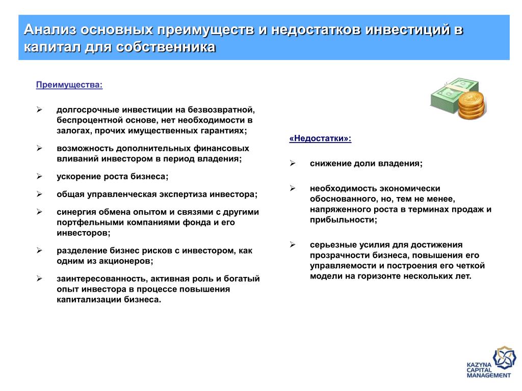 Анализ основных преимуществ и недостатков инвестиций в капитал для собственника • Преимущества: • долгосрочные инвестиции на безвозвратной, беспроцентной основе, нет необходимости в залогах, прочих имущественных гарантиях; • возможность дополнительных финансовых вливаний инвестором в период владения; • ускорение роста бизнеса; • общая управленческая экспертиза инвестора; • синергия обмена опытом и связями с другими портфельными компаниями фонда и его инвесторов; • разделение бизнес рисков с инвестором, как одним из акционеров; • заинтересованность, активная роль и богатый опыт инвестора в процессе повышения капитализации бизнеса. «Недостатки»: • снижение доли владения; • необходимость экономически обоснованного, но, тем не менее, напряженного роста в терминах продаж и прибыльности; • серьезные усилия для достижения прозрачности бизнеса, повышения его управляемости и построения его четкой модели на горизонте нескольких лет.
