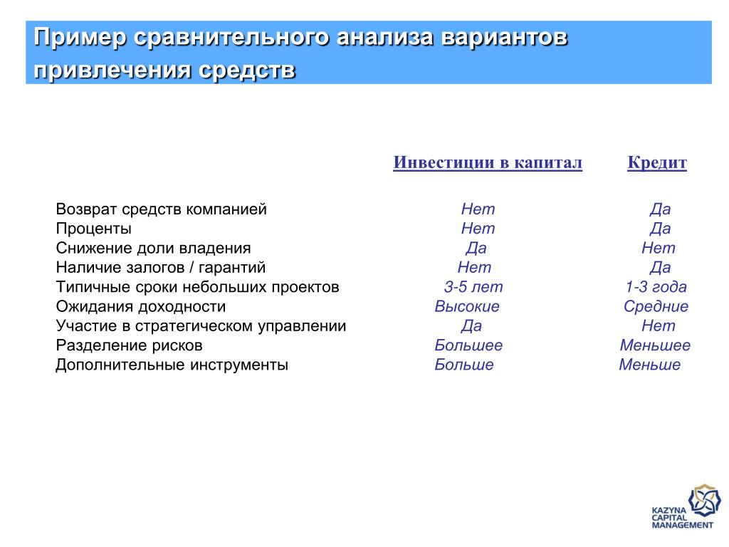 Возврат средств компанией Нет Да Проценты Нет Да Снижение доли владения Да Нет Наличие залогов / гарантий Нет Да Типичные сроки небольших проектов 3-5 лет 1-3 года Ожидания доходности Высокие Средние Участие в стратегическом управлении Да Нет Разделение рисков Большее Меньшее Дополнительные инструменты Больше Меньше Пример сравнительного анализа вариантов привлечения средств Инвестиции в капитал Кредит