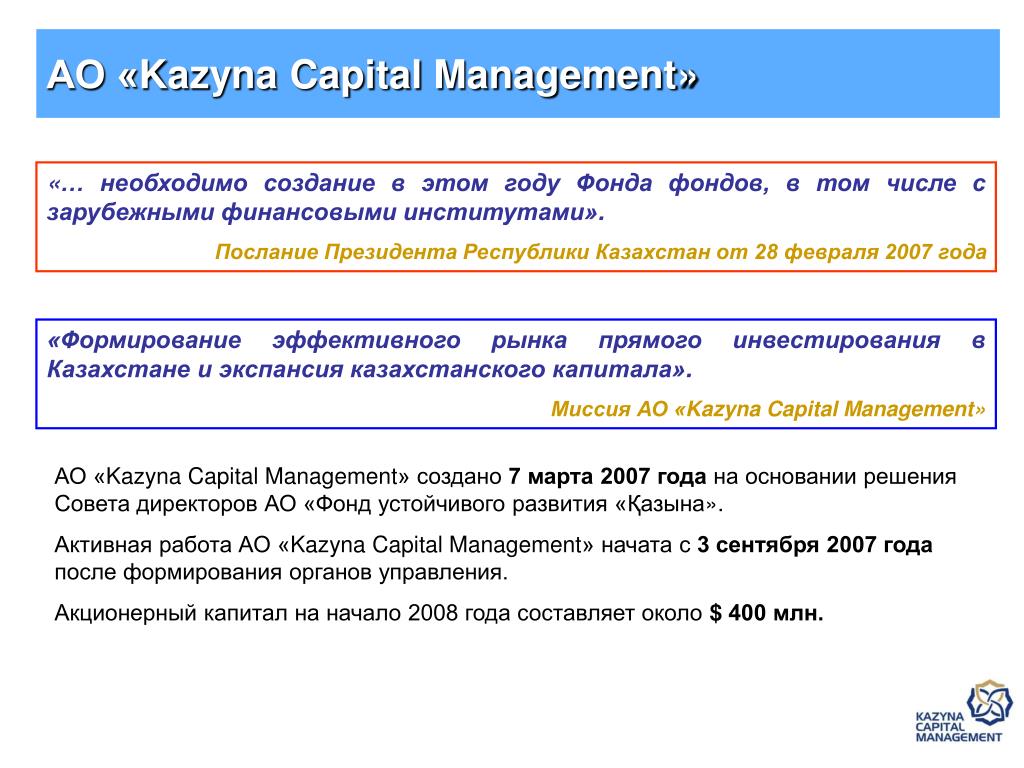 АО «Kazyna Capital Management» «… необходимо создание в этом году Фонда фондов, в том числе с зарубежными финансовыми институтами». Послание Президента Республики Казахстан от 28 февраля 2007 года «Формирование эффективного рынка прямого инвестирования в Казахстане и экспансия казахстанского капитала». Миссия АО «Kazyna Capital Management» АО «Kazyna Capital Management» создано 7 марта 2007 года на основании решения Совета директоров АО «Фонд устойчивого развития «Қазына». Активная работа АО «Kazyna Capital Management» начата с 3 сентября 2007 года после формирования органов управления. Акционерный капитал на начало 2008 года составляет около $ 400 млн.