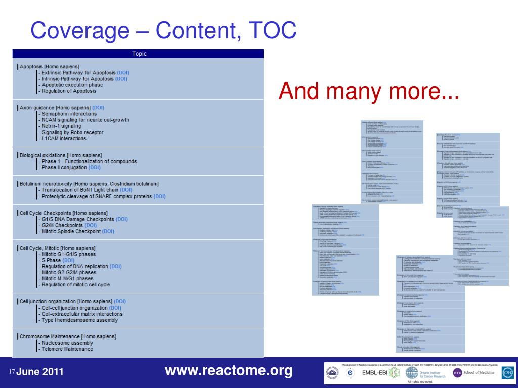 Data Expansion - Link-outs From Reactome GO Molecular Function Compartment Biological process KEGG, ChEBI – small molecules UniProt – proteins Sequence dbs – Ensembl, OMIM, Entrez Gene, RefSeq, HapMap, UCSC, KEGG Gene PubMed references – literature evidence for events
