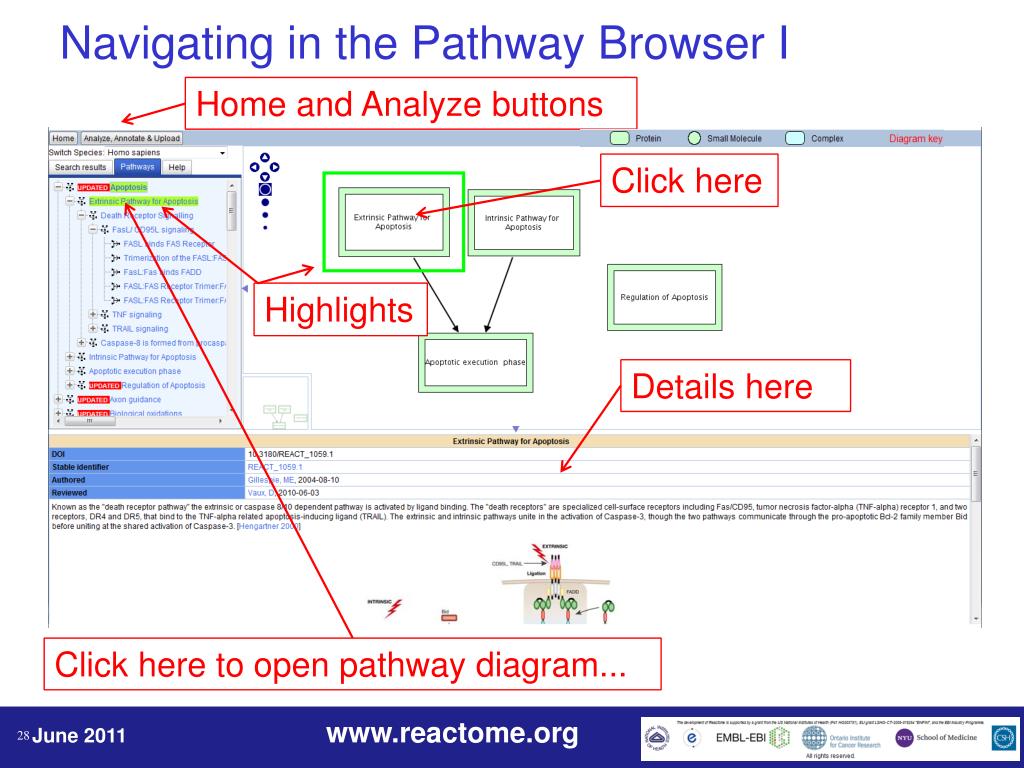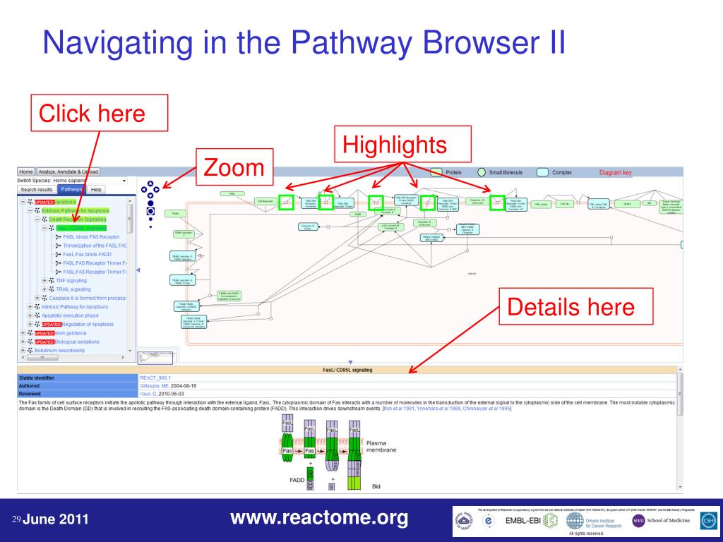 Navigating in the Pathway Browser II Highlights Details here Click here Zoom