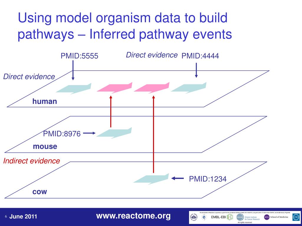 Using model organism data to build pathways – Inferred pathway events Direct evidence PMID:5555 PMID:4444 Direct evidence human PMID:8976 mouse Indirect evidence PMID:1234 cow